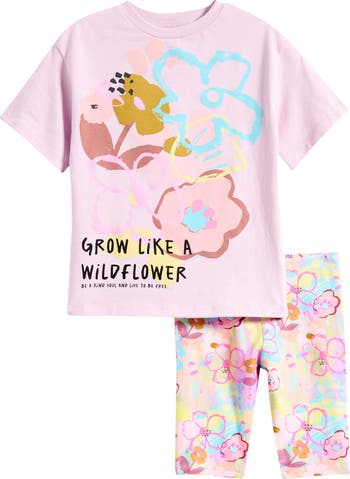 Your young wildflower will love this colorful set that pairs bright floral bike shorts with a cotton graphic T-shirt.