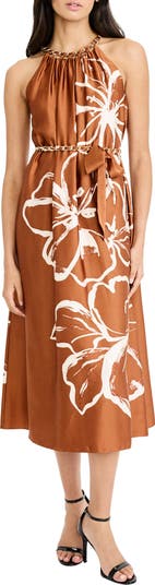 Gleaming links frame the neckline and waist of a breezy fit-and-flare dress emboldened by a painterly floral print.