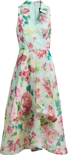 A high-low hemline adds extra flounce to a flower-filled party dress designed with a face-framing surplice V-neck polished with a smart collar.