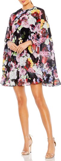 Mac Duggal Floral High Neck Mini Dress with Cape Overlay and Ruffle Hem, Main, color, Multi