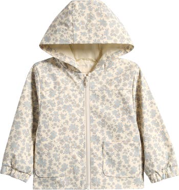 Keep your little one dry in drizzly weather with this hooded raincoat made of water resistant-coated fabric patterned with a sweet floral print.
