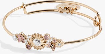 This floral bangle features a two-tone flower motif on an expandable wire bangle. The flower is a symbol of growth and renewal. Let your truest self blossom.