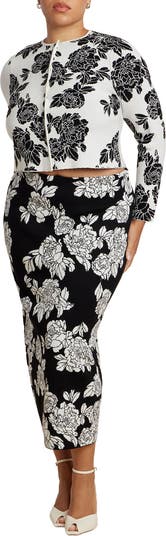 85% Viscose 15% PBT Close fit Unlined Pull on Elastic at waist Midi length 34” skirt length on size 18 Stretch sweater intarsia Machine wash cold gentle cycle with like colors. Only non-chlorine bleach when needed. Do not tumble dry. Lay flat to dry. Cool iron as needed.