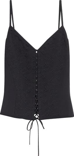 A tonal floral jacquard forms the center panels of this corset-style camisole designed with a laced-up front in true McQueen style—perfect for layering or wearing on its own.