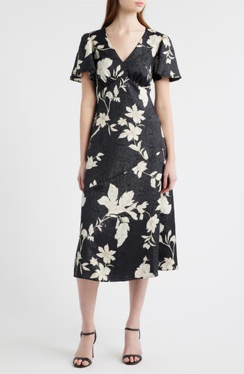 Fabulous floral print pops against a dark background on this jacquard midi dress framed by fluttering sleeves and cut in a beautifully draped silhouette.