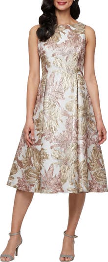 Shimmering jacquard blooms add to the elegant style of a stunning fit-and-flare cocktail dress perfected with hidden pockets.
