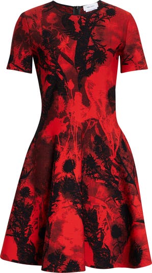 Knit in an intricate jacquard pattern with thorny thistles and photonegative blooms, this blood-red sweater-dress fashioned in a fit-and-flare silhouette reflects McQueen's macabre heritage.