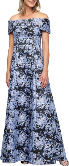 Painterly florals sweep across this off-the-shoulder jacquard gown bringing soft drama to an elegant evening silhouette.
