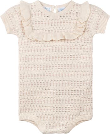 A sweet ruffle traces the yoke of this flower-jacquard bodysuit that's knit in a delicate pointelle stitch of soft, breathable cotton yarn.