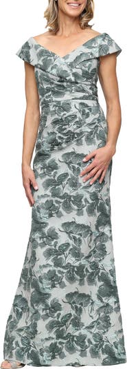 Structured ruching enhances the silhouette of this floral jacquard gown designed with an off-the-shoulder neckline for evening-ready romance.