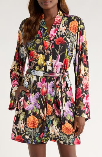 A garden of bold, bright blooms enchant an inky robe cut from soft, stretchy jersey with a tie sash at the waist.