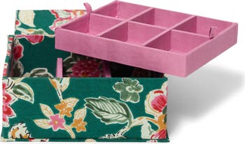 Made from cotton with a hand-printed floral design, this jewelry-organizer box is a beautiful and functional way to store your collection.