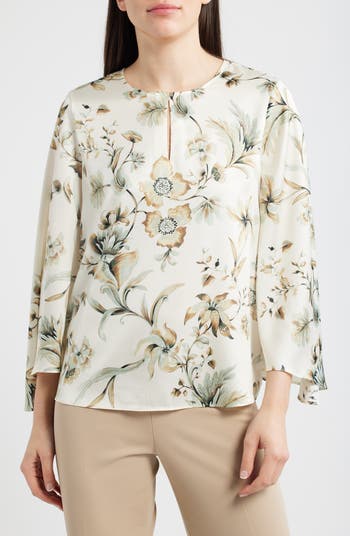 This floral-print stretch satin top brings fluid shine and soft movement to a refined silhouette. Designed with flutter sleeves, it features front and back keyholes at the jewel neckline for a subtle, elegant finish.