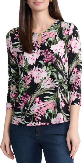 A color-pop floral print emboldens this easy top framed by three-quarter sleeves and fronted with a keyhole cutout.