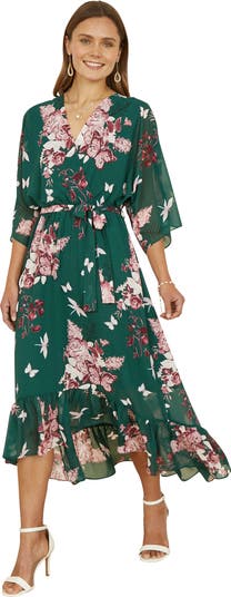 Flaunt your new fit at any special occasion this season, in this absolute knock out from Yumi. With a dipped hemline that swishes and flows, 3/4 length kimono style sleeves and that darling floral print, we know you will feel a million dollars in this dress. The wrap over neckline and self tie belt creates and lovely silhouette. Wear to a wedding or ladies day at the races and wait for the compliments to roll in.