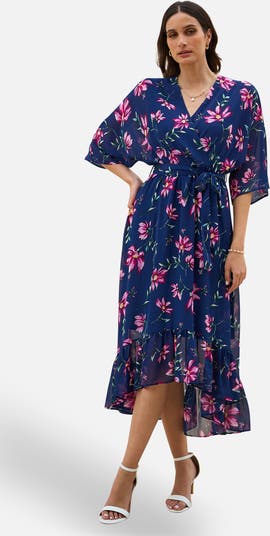 Flaunt your new fit at any special occasion this season, in this absolute knock out from Yumi. With a dipped hemline that swishes and flows, 3/4 length kimono style sleeves and that darling floral print, we know you will feel a million dollars in this dress. The wrap over neckline and self tie belt creates a lovely silhouette. Wear it to a wedding or ladies day at the races and wait for the compliments to roll in.