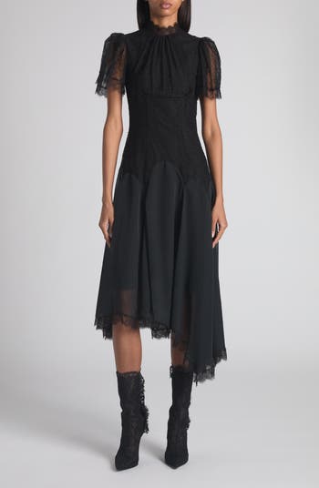 In true McQueen tradition, Sean McGirr marries gothic romance and Victorian glamour to alluring effect in this corset-detailed evening dress cut from floral lace and sheer chiffon.