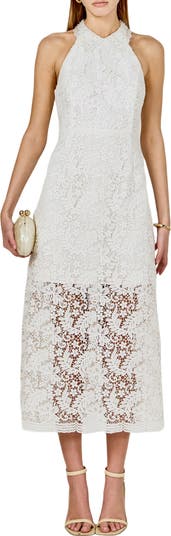 Enchant the room in an all-lace dress textured in blooms and designed to show off your shoulders.