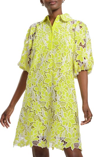Shirtdress style is so much sweeter with lacy blooms, puff sleeves and a swingy fit.