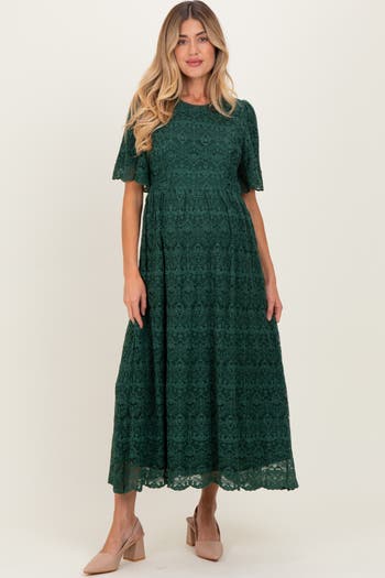 Elevate your maternity wardrobe with this Forest Green Floral Lace Maternity Midi Dress. Designed with delicate floral lace throughout, this elegant dress features a flattering empire waist to accommodate your growing bump comfortably. The soft, breathable fabric ensures all-day comfort, while the modest round neckline and flutter sleeves add a touch of femininity. Its midi length is perfect for both casual and formal occasions, making it a versatile staple for your pregnancy and beyond. Pair with your favorite heels or flats to complete the look with effortless grace. Embrace style and comfort during this special time!
