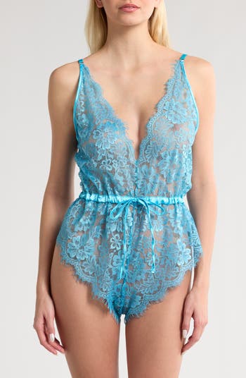 Sweet floral lace lends enchanting romance to this sheer teddy fashioned with scalloped edges and a plunging neck.