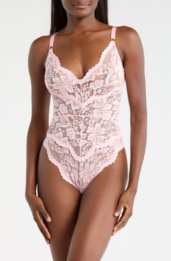 Sweet floral lace lends enchanting romance to this sheer teddy fashioned with scalloped edges and fully adjustable strap.