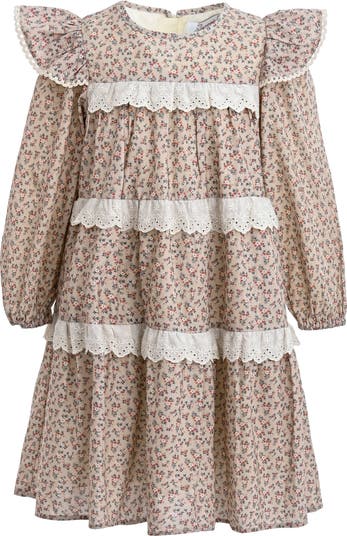 A vintage-inspired beige dress adorned with delicate floral prints, flutter sleeves, and horizontal lace trims—designed for timeless charm and graceful movement. Romantic details: tiered silhouette with puff sleeves and lace accents across bodice and skirt. Occasion-ready: ideal for family gatherings, portraits, or special celebrations with a nostalgic touch.
