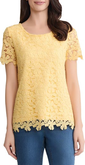 Allover lace brings delicate texture to this charming top designed with a polished jewel neckline.