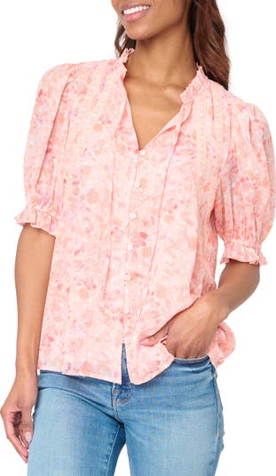 A split neck with ties and delicate lace trims update a classic button-up shirt patterned by pretty watercolor blooms.