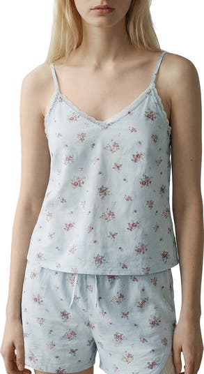 Drift off to dreamland in comfort with this airy pajama set featuring a delightful floral print and lace trim.