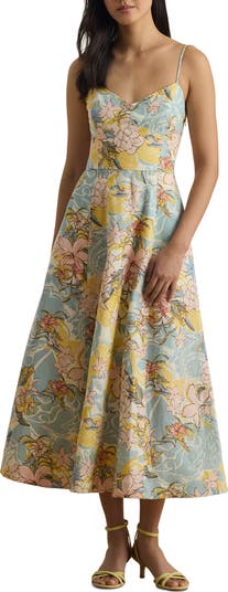 Nostalgic blooms add retro appeal to a summery linen dress hung from slim straps and perfected with a pair of pockets.