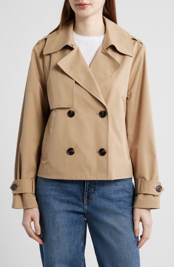 A shorter-length trench is made in a double-breasted silhouette with classic details like oversized lapels and belted cuffs.