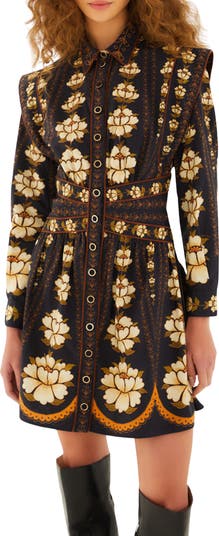 A dark background lets the flowery fields pop off a cotton dress designed with showy shoulders and shaped at the waist.