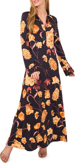 Bright blooms pop off the dark background of this fluid maxi dress designed with a jaunty collar.