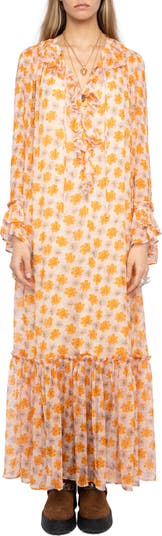 Bring out the boho-chic in a groovy maxi dress showered in flowers and accented in fluttering ruffly bits.