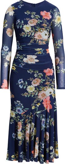 An asymmetric flounce brings soft movement to the hem of this stretchy body-con dress featuring a realistic floral print and shirred side seams.