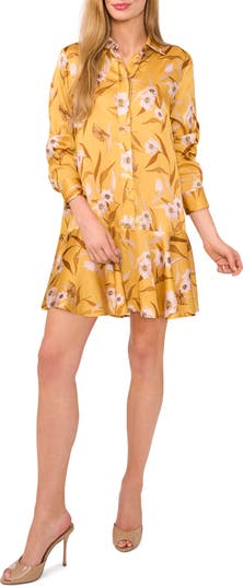 Take shirtdress style for a shorter ride in this satin option covered in pretty blooms and cut to bare some leg.