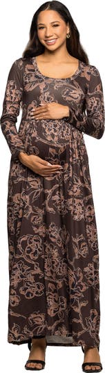 Make elegance effortless with this Brown Blush Floral Long Sleeve Scoop Neck Maxi Dress. Designed in a timeless silhouette, this maternity maxi dress features a flattering scoop neckline, fitted bodice, and softly gathered waist that flows into a graceful floor length skirt. The allover blush floral print against a rich brown background adds sophistication, making it perfect for both casual days and evening occasions. Crafted from a comfortable, easy care polyester blend, this long sleeve maxi dress is a versatile wardrobe essential.