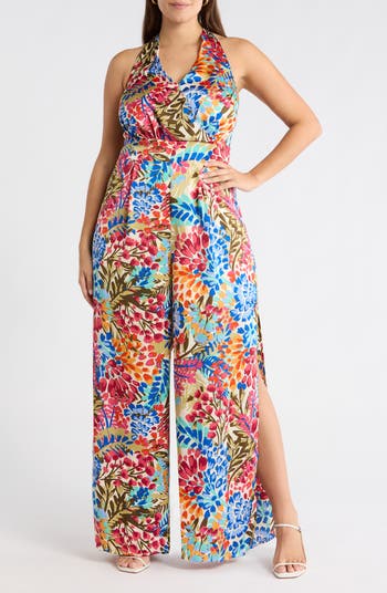 Make a moment in this lustrous floral-print satin halter jumpsuit. A surplice neckline flatters the frame, while a wide, waist-defining band gives shape before falling into pleated wide legs. Side slits add movement and a hint of leg with every step.