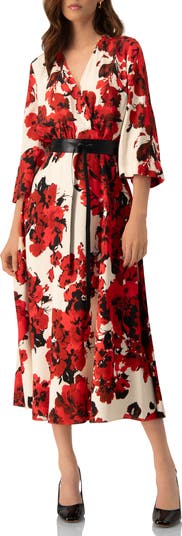 - A sophisticated maxi dress featuring a striking red and black floral print on a soft cream background. Designed with a wrap-style V-neckline, wide 3/4 sleeves, and a flowy A-line skirt for effortless elegance. Accentuated with a sleek black belt at the waist to enhance your silhouette