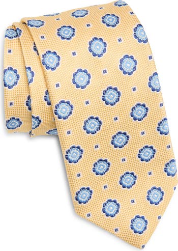 Colorful floral medallions bring smart, neat detailing to a tie crafted from a textured silk blend that adds polish and distinction to any elevated or semiformal look. It pairs well with smoother fabrics and solid colors, but there's always room for mixing patterns and textures to define your personal style.