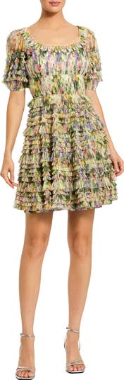 Floral ruffled mini dress with smocked bodice, square neckline, and tiered skirt. A feminine silhouette perfect for daytime events, parties, or summer occasions fun.