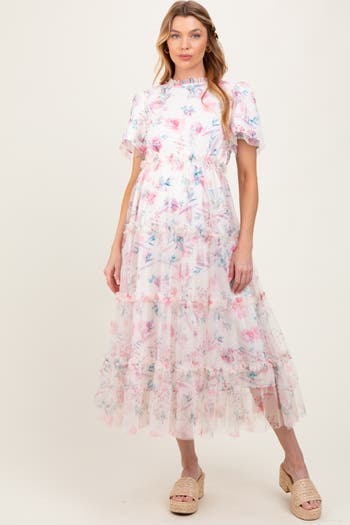 Embrace elegance and comfort with this Floral Mesh Ruffle Tiered Maternity Midi Dress, designed to celebrate your pregnancy in style. Crafted with delicate mesh fabric featuring a soft floral pattern, this dress offers a lightweight and breathable feel. The tiered skirt and ruffle details add a romantic, feminine touch while providing ample room to accommodate your growing bump. With short puff sleeves and a modest neckline, it’s perfect for special occasions or everyday wear. Pair it with sandals or heels for a chic maternity look that effortlessly blends comfort and grace.