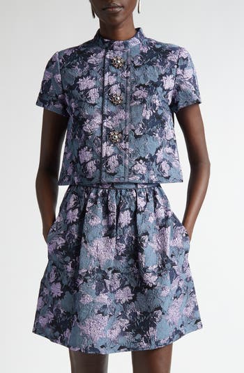 Jewelry-inspired buttons twinkle at the placket of this short-sleeve shirt cut from richly textured metallic jacquard in an abstract floral motif