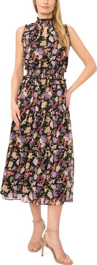A floral-print dress drifts in a light and airy fabric, detailed with soft smocking at the mock neck, armholes and waist for gentle shape. A keyhole neckline and a tiered midi-length skirt add romantic movement to this effortlessly graceful silhouette.