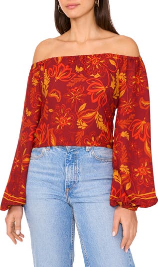 Stretchy elastic makes it easy to slip the neckline off your shoulders in this pretty floral top that owes its blousy fit and soft silhouette to an airy, crepe fabrication.