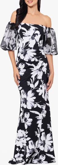 Striking flowers romance a stunning off-the-shoulder evening gown framed by organza puff sleeves and artful side ruching.