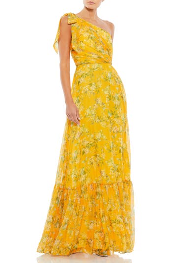 This vibrant floral maxi dress features a one-shoulder design with a bow detail, complemented by a flowy tiered skirt for a chic and feminine look. Perfect for any special event or celebration.