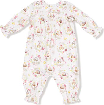 A whimsical print and smocked yoke sweeten this long-sleeve romper made for baby's comfort from stretchy jersey.