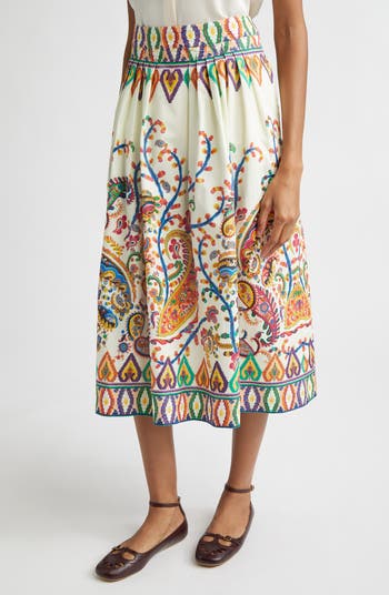 Crisp Italian-cotton voile provides a fresh canvas for a kaleidoscopic mix of vibrant flora and house-signature paisley motifs on this pleated A-line skirt—bringing a boho-eclectic element to your warm-weather wardrobe.